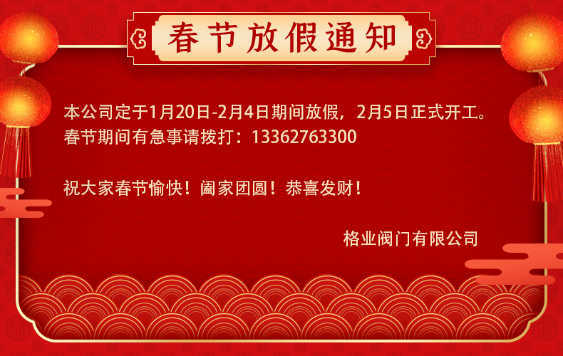 格業(yè)閥門定于1月20日-2月4日期間放假,2月5日正式開工。